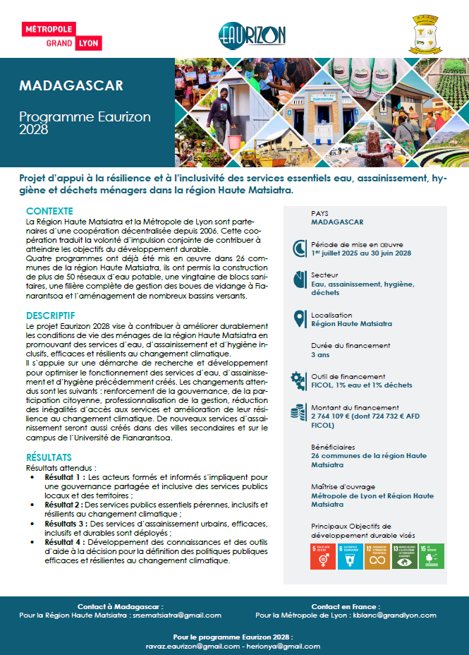 Depuis 2006, la Métropole de Lyon et la Région Haute Matsiatra, à Madagascar, mènent un partenariat structurant dans le domaine de l'eau, de l'assainissement, de l'hygiène (EAH) et depuis 2024 dans le domaine des déchets. Née de contacts initiés dès les années 1990, cette coopération décentralisée illustre une démarche progressive de renforcement des capacités locales, aujourd'hui reconnue comme un modèle de solidarité internationale efficace.