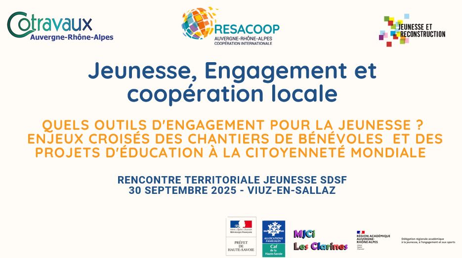 Les équipes du SDJES ont sollicité RESACOOP pour co-animer avec les associations “Cotravaux” et “Jeunesse et Reconstruction” deux sessions d’ateliers pour présenter nos programmes respectifs d’engagement des jeunesses. Au total, c’est plus de 70 professionnels qui se sont inscrits à cet atelier et qui ont pu découvrir l’éducation à la citoyenneté mondiale, son importance dans la construction d’un parcours d’engagement qui commence ici et comme premier pas possible vers un projet de mobilité internationale.