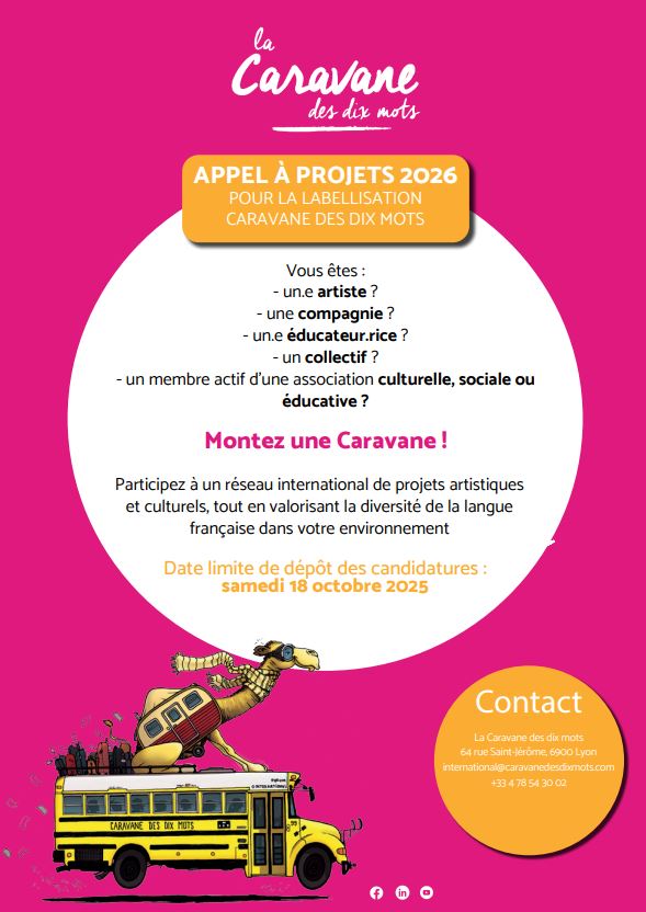 Toute structure artistique, culturelle ou éducative francophone (associations, compagnies, établissements scolaires, centres culturels…) peut proposer un projet à labelliser “Caravane des dix mots”.
