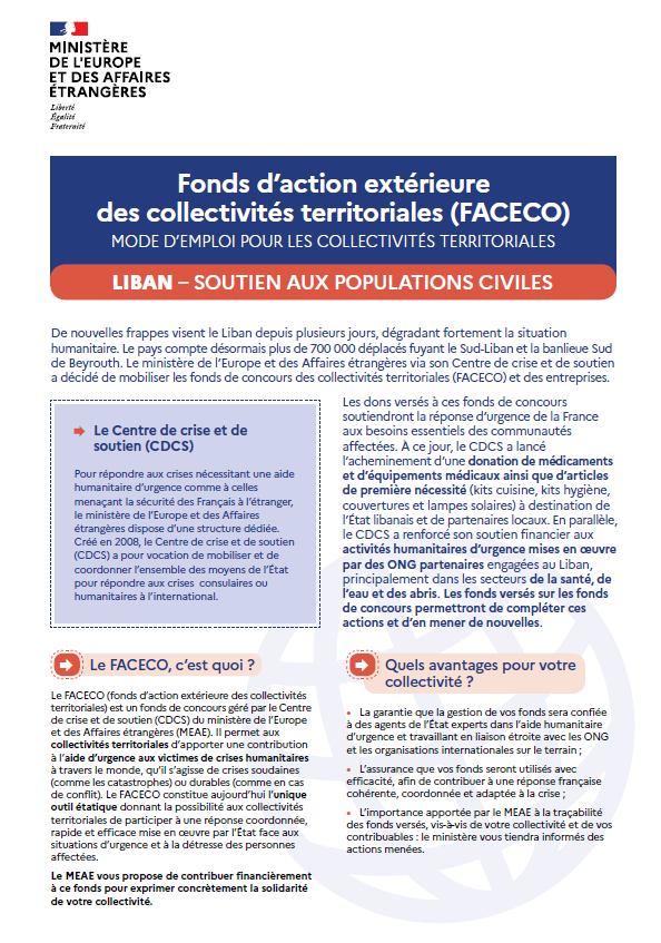 De nouvelles frappes visent le Liban depuis plusieurs jours, dégradant fortement la situation humanitaire. Le pays compte désormais plus de 700 000 déplacés fuyant le Sud-Liban et la banlieue Sud de Beyrouth. Pour soutenir les populations civiles au Liban le ministère de l'Europe et des Affaires étrangères (MEAE) via son Centre de crise et de soutien (CDCS) a activé, à la demande du Ministre, les fonds de concours qui peuvent accueillir des contributions financières des collectivités territoriales (FACECO) et des entreprises. Les dons versés soutiendront la réponse d'urgence de la France aux besoins essentiels des communautés affectées. Ils permettront de conduire des opérations d'acheminement d'aide humanitaire ainsi qu'à renforcer le soutien de la France à des ONG partenaires engagées au Liban.