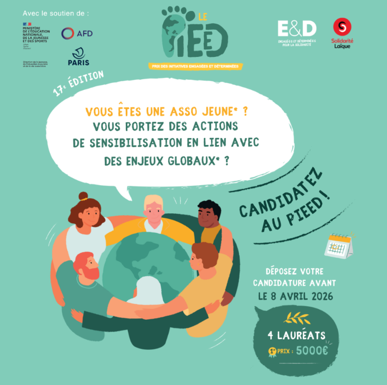 Ouverture des candidatures pour la 17ᵉ édition du PIEED – Prix des Initiatives Engagées et Déterminées pour l'Éducation à la Citoyenneté et à la Solidarité Internationale (ECSI). Ce dispositif national vise à encourager, accompagner et valoriser des projets innovants portés par des associations de jeunes et des junior associations qui œuvrent pour une citoyenneté active et solidaire à travers des actions pédagogiques et mobilisatrices.